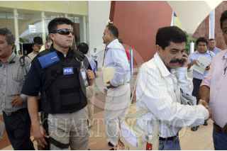 ACAPULCO, GUERRERO, 21MARZO2013.- El alcalde de Teloloapan, Ignacio Valladares, llegó a la firma del Mando Único para la creación de la Policía Estatal que encabezó el gobernador Ángel Aguirre Rivero llegó fuertemente resguardado por agentes de la Procuraduría General de la República (PGR). FOTO: BERNARDO HERNÁNDEZ /CUARTOSCURO.COM