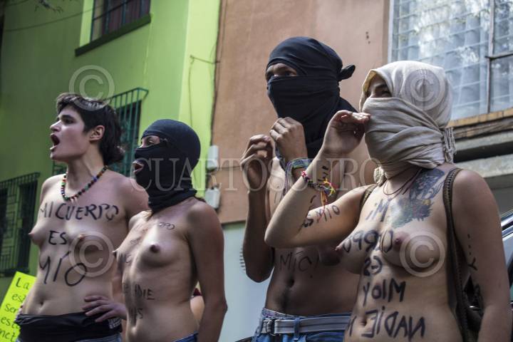 MÉXICO, D.F., 22MARZO2013.-Mujeres de Organizaciones feministas y sociales se manifestaron en las instalaciones del Centro de Oración Musulmana, en apoyo a Amina, la joven tunecina que mostró sus pechos en una foto de Facebook como forma de reivindicación de las libertades de las mujeres musulmanas y que fue condenada a morir después de 100 latigazos. FOTO: RODRIGO B.S /CUARTOSCURO.COM