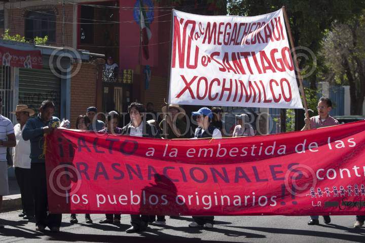 MÉXICO, D.F., 23MARZO2013.- Integrantes de los barrios populares de Xochimilco y adherentes a la Sexta Delcaración de la selva Lacandona, marcharon por el barrio de San Pablo en protesta por la construcción de una tienda departamental "Chedraui" además a las afueras del predio en construcción los manifestantes clausuraron de manera simbólica las obras. FOTO: FRANCISCO RODRÍGUEZ /CUARTOSCURO.COM