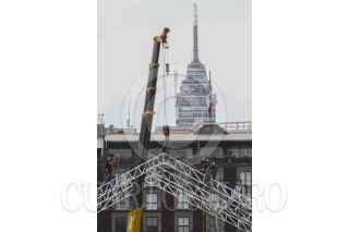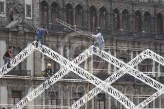 MÉXICO, D.F., 27MARZO2013.- Trabajadores sin medidas de protección, retiran la estructura de la exposición "Aldea Digital" que la empresa Teléfonos de México montó en el zócalo capitalino. FOTO: IVAN STEPHENS /CUARTOSCURO.COM