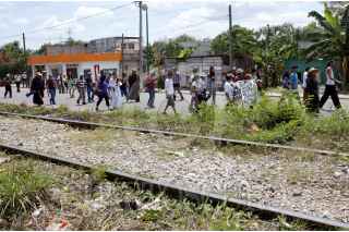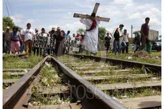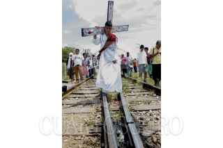 TENOSIQUE, TABASCO, 29MARZO2013.- La representación del viacrucis migrante en su segundo día partió desde la comunidad de Guadalupe Victoria; lugar en donde muchas veces los centroamericanos son asaltados y violados. Caminaron por la carretera y vías férreas acompañados por el fray Tomas González, quien a su paso denunciaba los maltratos y bajezas del crimen organizado y de autoridades corruptas. FOTO: MARCO POLO GUZMÁN HERNÁNDEZ /CUARTOSCURO.COM