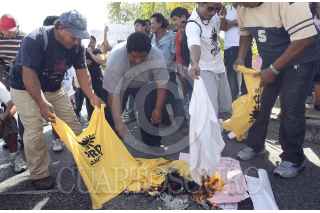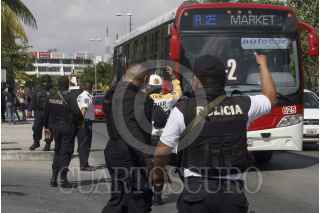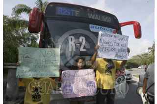 CANCÚN, QUINTANA ROO, 01ABRIL2013.- Un grupo de personas con pancartas y mantas en contra del aumento a la tarifa del transporte público y el alza de la gasolina cerraron parcialmente el acceso a la Zona Hotelera, impidiendo el paso a camiones provocando un gran congestionamiento vial. Algunos de los manifestantes que portaban camisetas amarillas y el logo del PRD coreaban consignas contra el Alcalde Julián Ricalde Magaña por supuestamente permitir el incremento al pasaje, aunque fue el Ayuntamiento de Benito Juárez el que, mediante una sesión extraordinaria de Cabildo, rechazó el aumento. Los supuestos perredistas no lo eran porque tras protestar contra el Alcalde con sus camisetas puestas, quemaron sus playeras en un alarde de rechazo al partido que gobierna la ciudad. FOTO: CSPHOTO /CUARTOSCURO.COM