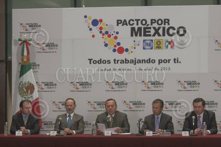 MÉXICO, D.F., 01ABRIL2013.- El Consejo Rector del Pacto por México presentó cuatro acuerdos entre los que se incluyen las audiencias públicas para que se logren los consensos necesarios en las reformas pendientes en materia educativa, financiera, de seguridad y justicia. Los integrantes del Pacto por México encabezados por el presidente del Consejo Rector y dirigente del PRD, Jesús Zambrano Grijalva, asi como los presidentes de los demás partidos César Camacho Quiróz, del PRI, Gustavo Madero, del PAN, y el Secretario de Gobernación, Miguel Angel Osorio Chong, y el Secretario de Hacienda, Luis Vidergaray, explicaron que no se excluirá a nadie de la discusión y para ello conformarán diversos grupos de discusión. FOTO: JUAN PABLO ZAMORA /CUARTOSCURO.COM