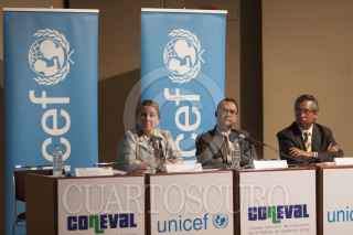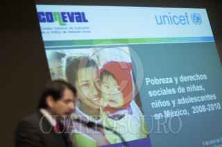 MÉXICO, D.F., 03MARZO2013.- Isabel Crowley, representante de Unicef México, Gonzalo Hernández Licona, secretario ejecutivo de Coneval, y Rodolfo de la Torre, coordinador de la oficina de investigación de la PNUD, durante la presentación del estudio "Pobreza y derechos sociales de niñas. niños y adolescentes en México, 2008-2010", en el Museo Franz Mayer. FOTO: MOISÉS PABLO /CUARTOSCURO.COM