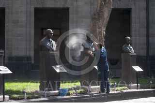 MÉXICO, D.F., 04ABRIL2013.- Un trabajador de mantenimiento limpia los bustos de varios ex secretarios de salud que se encuentran en el interior de la Secretaría de Salud. FOTO: DIEGO SIMÓN SÁNCHEZ /CUARTOSCURO.COM