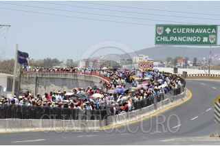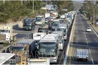 CHILPANCINGO, GUERRERO, 04ABRIL2013.- La mañana de este jueves maestros de la Coordinadora Estatal de Trabajadores de la Educación de Guerrero (CETEG) marcharon por la Autopista del Sol. Con altavoces señalaron que se trata de una movilización dentro de las acciones que realiza la Coordinadora Nacional de Trabajadores de la Educación (CNTE) a nivel nacional. Los maestros iniciaron su marcha frente a las instalaciones de la Coordinadora en Chilpancingo. Cruzaron la lateral y tomaron los dos carriles de la Autopista del Sol para marchar hacia el sur, con dirección a Acapulco. Los vehículos que viajan hacia Acapulco fueron desviados por la lateral y luego por la Avenida del Río Huacapa, que corre paralela a la autopista. Durante la marcha los maestros de la Coordinadora insistieron en criticar al Congreso de Guerrero que rechazó la iniciativa que, en su nombre presentó el Gobierno estatal para modificar la Ley Estatal de Educación. La suspensión indefinida de clases lleva ya 38 días en Guerrero. En la imagen filas de carros y autobuses permanecieron varados por horas en la Autopista del Sol. FOTO: BERNANDINO HERNÁNDEZ /CUARTOSCURO.COM