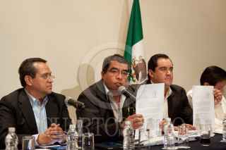 MÉXICO, D.F., 05ABRIL2013.- Juan Manuel Oliva, secretario adjunto del PAN, Vladimir Aguilar, secretario de Planeación del Partido de la Revolución Democrática, y Gerardo Espinoza, dirigente del PRD en Zacatecas, ofrecieron una conferencia de prensa sobre el rechazo del Instituto Electoral del Estado de Zacatecas ante la posibilidad de una alianza electoral entre el PRD y el PAN en aquel estado.. FOTO: MOISÉS PABLO /CUARTOSCURO.COM