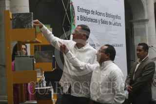 OAXACA, OAXACA, 06ABRIL2013.- El gobernador de Oaxaca, Gabino Cué encabezó en el patio central del Palacio de Gobierno la entrega de Acervo Bibliográfico a Bibliotecas Públicas y Salas de Lectura de Oaxaca. Al concluir el evento el mandatario afirmó que la presencia de la Policía Federal en Oaxaca por ahora no es necesaria, pues el accionar de la Sección 22 del SNTE no ha afectado a terceros y se ha mantenido en el marco de la ley. FOTO: ARTURO PÉREZ ALFONSO /CUARTOSCURO.COM
