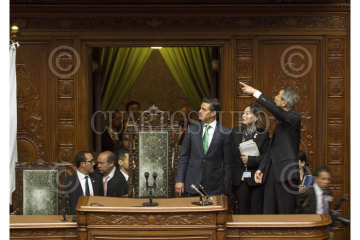 TOKIO, JAPÓN, 09ABRIL2013.- En la Conferencia Magistral que dictó en la Universidad de las Naciones Unidas, el Presidente Enrique Peña Nieto estuvo acompañado por los secretarios de Relaciones Exteriores, José Antonio Meade Kuribreña; de Turismo, Claudia Ruiz Massieu, y de Economía, Ildefonso Guajardo Villarreal, así como por el Director General de Petróleos Mexicanos, Emilio Lozoya Austin, y el Coordinador General de Comunicación Social, David López Gutiérrez. FOTO: PRESIDENCIA /CUARTOSCURO.COM