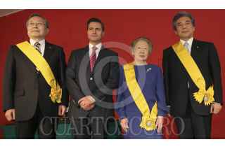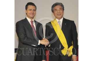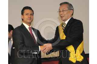 TOKYO, JAPÓN, 10ABRIL2013.- Los ciudadanos japoneses Hirofumi Nakasone, Takashi Yamanouchi y Sadako Ogata, recibieron de Enrique Peña Nieto, presidente de México, la Orden Mexicana del Águila Azteca, el máximo galardón que otorga México a quienes han prestado servicios prominentes a nuestra nación o a la humanidad. FOTO: PRESIDENCIA /CUARTOSCURO.COM