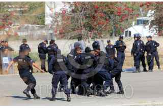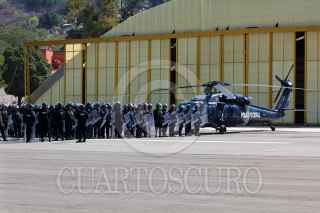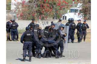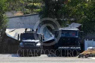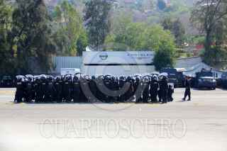 CHILPANCINGO, GUERRERO, 17ABRIL 2013.- Alrededor de dos mil elementos antimotimotines de la Policía Federal, practican técnicas disuasivas en las pistas del aeropuerto de la ciudad, previo a la mega-marcha de maestros disidentes realizaran el día de mañana, tanquetas que lanzan chorros de agua, se observan en los hangares del aeropuerto. FOTO: SAÚL LÓPEZ /CUARTOSCURO.COM