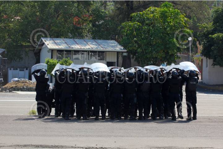 CHILPANCINGO, GUERRERO, 17ABRIL 2013.- Alrededor de dos mil elementos antimotimotines de la Policía Federal, practican técnicas disuasivas en las pistas del aeropuerto de la ciudad, previo a la mega-marcha de maestros disidentes realizaran el día de mañana, tanquetas que lanzan chorros de agua, se observan en los hangares del aeropuerto. FOTO: SAÚL LÓPEZ /CUARTOSCURO.COM