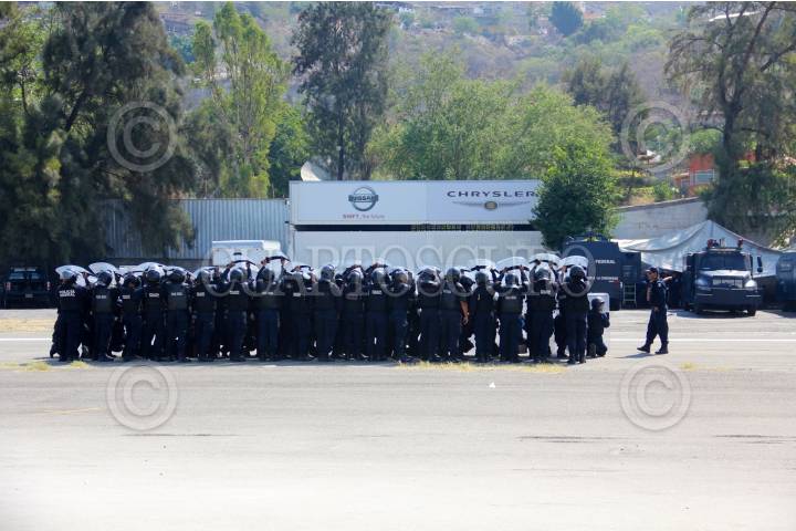CHILPANCINGO, GUERRERO, 17ABRIL 2013.- Alrededor de dos mil elementos antimotimotines de la Policía Federal, practican técnicas disuasivas en las pistas del aeropuerto de la ciudad, previo a la mega-marcha de maestros disidentes realizaran el día de mañana, tanquetas que lanzan chorros de agua, se observan en los hangares del aeropuerto. FOTO: SAÚL LÓPEZ /CUARTOSCURO.COM