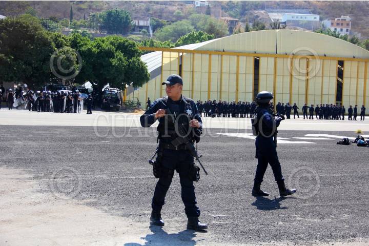 CHILPANCINGO, GUERRERO, 17ABRIL 2013.- Alrededor de dos mil elementos antimotimotines de la Policía Federal, practican técnicas disuasivas en las pistas del aeropuerto de la ciudad, previo a la mega-marcha de maestros disidentes realizaran el día de mañana, tanquetas que lanzan chorros de agua, se observan en los hangares del aeropuerto. FOTO: SAÚL LÓPEZ /CUARTOSCURO.COM