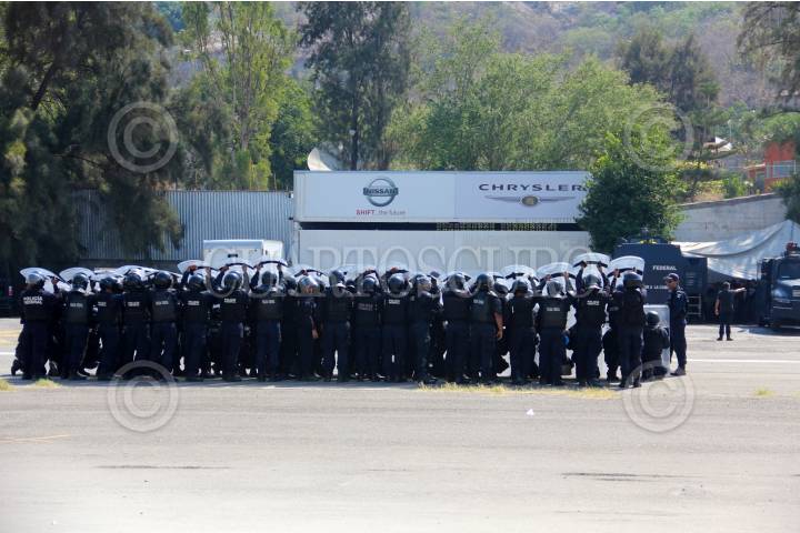 CHILPANCINGO, GUERRERO, 17ABRIL 2013.- Alrededor de dos mil elementos antimotimotines de la Policía Federal, practican técnicas disuasivas en las pistas del aeropuerto de la ciudad, previo a la mega-marcha de maestros disidentes realizaran el día de mañana, tanquetas que lanzan chorros de agua, se observan en los hangares del aeropuerto. FOTO: SAÚL LÓPEZ /CUARTOSCURO.COM