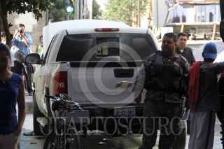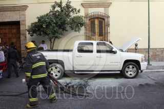 GUADALAJARA, JALISCO 17ABRIL2013.- Una camioneta pick up en color blanco fue incendiada esta tarde de manera premeditada, según testigos mencionan que dos personas rompieron el cristal del vehículo para después arrojar una bomba molotov. El hecho se registro, en la calle Liceo entre San Felipe y Reforma en pleno centro de la ciudad. De acuerdo con los reportes, la Cheyenne de modelo reciente con placas JP23981 estaba estacionada sobre la calle de Liceo, afuera de la Fundación Álvarez del Castillo. FOTO: FERNANDO CARRANZA GARCÍA /CUARTOSCURO.COM