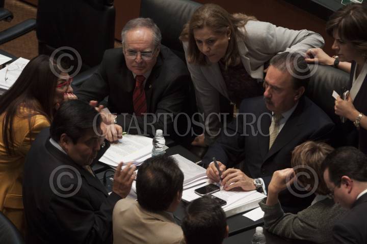 MÉXICO, D.F., 18ABRIL2013.- Los coordinadores Ernesto Cordero, PAN, Miguel Barbosa, PRD y Emilio Gamboa Patrón, PRI, conversan en la sesión, por la tarde se espera que la reforma en materia de telecomunicaciones se aprobada en comisiones y mañana misma sea votada en el pleno de la Cámara Alta. FOTO: MOISÉS PABLO /CUARTOSCURO.COM