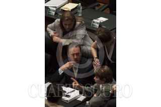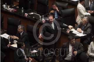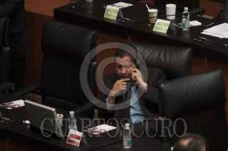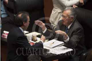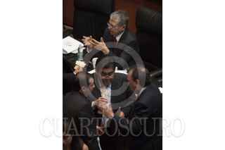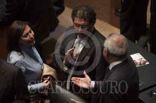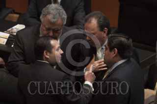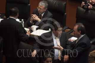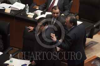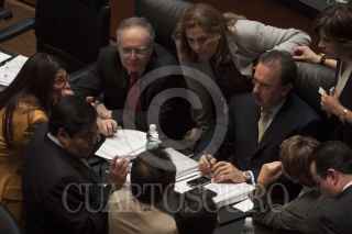 MÉXICO, D.F., 18ABRIL2013.- Los coordinadores Ernesto Cordero, PAN, Miguel Barbosa, PRD y Emilio Gamboa Patrón, PRI, conversan en la sesión, por la tarde se espera que la reforma en materia de telecomunicaciones se aprobada en comisiones y mañana misma sea votada en el pleno de la Cámara Alta. FOTO: MOISÉS PABLO /CUARTOSCURO.COM