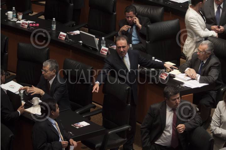 MÉXICO, D.F., 18ABRIL2013.- Los coordinadores Ernesto Cordero, PAN, Miguel Barbosa, PRD y Emilio Gamboa Patrón, PRI, conversan en la sesión, por la tarde se espera que la reforma en materia de telecomunicaciones se aprobada en comisiones y mañana misma sea votada en el pleno de la Cámara Alta. FOTO: MOISÉS PABLO /CUARTOSCURO.COM