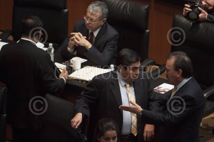 MÉXICO, D.F., 18ABRIL2013.- Los coordinadores Ernesto Cordero, PAN, Miguel Barbosa, PRD y Emilio Gamboa Patrón, PRI, conversan en la sesión, por la tarde se espera que la reforma en materia de telecomunicaciones se aprobada en comisiones y mañana misma sea votada en el pleno de la Cámara Alta. FOTO: MOISÉS PABLO /CUARTOSCURO.COM