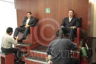 MÉXICO, D.F., 18ABRIL2013.- Los coordinadores Miguel Barbosa, PRD, y Emilio Gamboa, PRI, aprovecharon el receso en la sesión de hoy para bolearse los zapatos, el pleno esta en espera de recibir el dictamen de la ley de telecomunicaciones y darle primera lectura para que mañana se vote en sesión. FOTO: IVÁN MENDEZ /CUARTOSCURO.COM