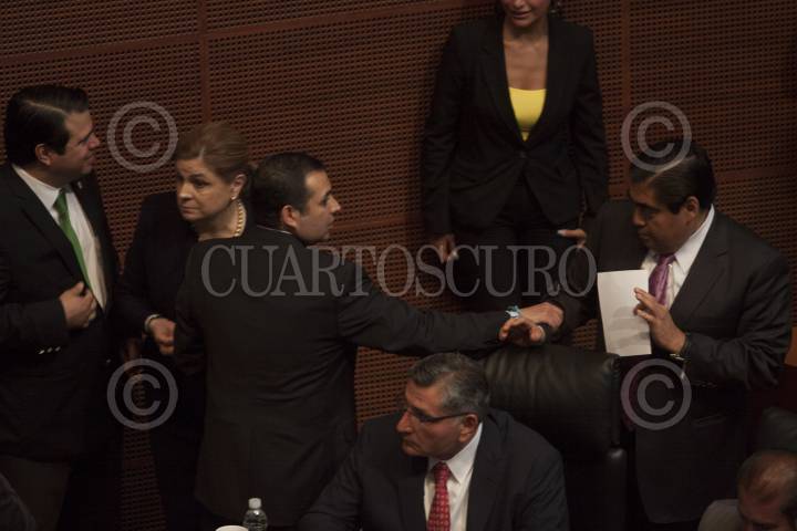 MÉXICO, D.F., 25ABRIL2013.- Conversación entre el Ernesto Cordero y el perredista Miguel Barbosa, en la sesión de la Cámara de Senadores. FOTO: MOISÉS PABLO /CUARTOSCURO.COM