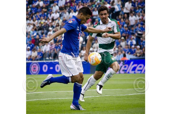 MÉXICO, D.F., 27ABRIL2013.- Christian Giménez (Cruz Azul), y Marc Crosas (Santos), durante el partido correspondiente a la jornada 16 del Torneo Clausura 2013 de la Liga MX entre el Cruz Azul vs Santos Laguna y llevado acabo en el estadio Azul. FOTO: MISAEL VALTIERRA / CUARTOSCURO.COM