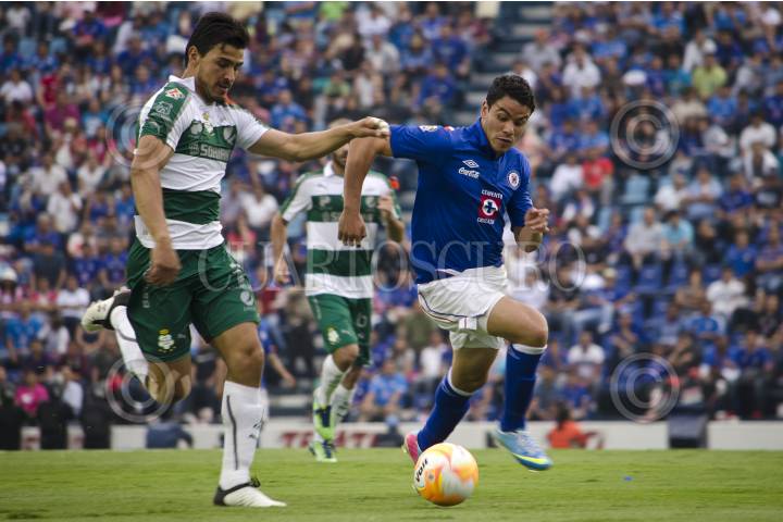 MÉXICO, D.F., 27ABRIL2013.- Christian Giménez (Cruz Azul), y Marc Crosas (Santos), durante el partido correspondiente a la jornada 16 del Torneo Clausura 2013 de la Liga MX entre el Cruz Azul vs Santos Laguna y llevado acabo en el estadio Azul. FOTO: MISAEL VALTIERRA / CUARTOSCURO.COM