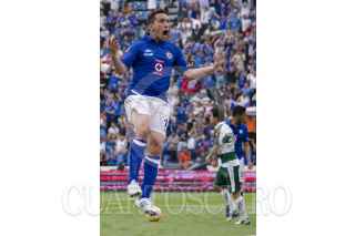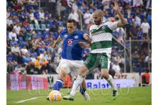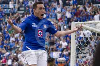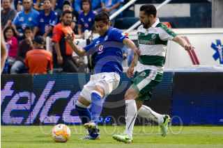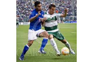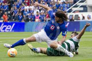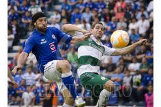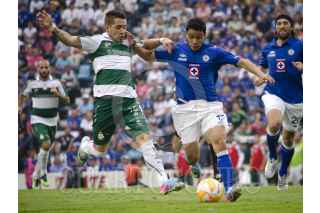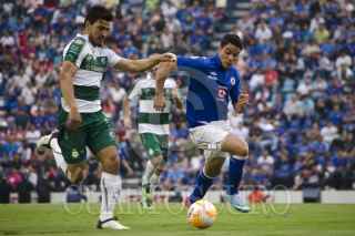 MÉXICO, D.F., 27ABRIL2013.- Christian Giménez (Cruz Azul), y Marc Crosas (Santos), durante el partido correspondiente a la jornada 16 del Torneo Clausura 2013 de la Liga MX entre el Cruz Azul vs Santos Laguna y llevado acabo en el estadio Azul. FOTO: MISAEL VALTIERRA / CUARTOSCURO.COM