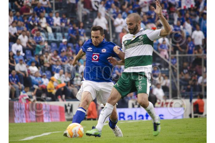 MÉXICO, D.F., 27ABRIL2013.- Christian Giménez (Cruz Azul), y Marc Crosas (Santos), durante el partido correspondiente a la jornada 16 del Torneo Clausura 2013 de la Liga MX entre el Cruz Azul vs Santos Laguna y llevado acabo en el estadio Azul. FOTO: MISAEL VALTIERRA / CUARTOSCURO.COM