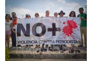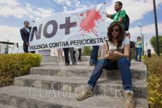 QUERÉTARO, QUERÉTARO, 28ABRIL2013.- Periodistas queretanos de diferentes casas editoriales se sumaron este medio día a la Movilización Nacional contra el Crimen e Impunidad en el evento llamado Un día por el Periodismo. En la protesta silenciosa de Querétaro las y los comunicadores mostraron una manta con la leyenda No Más Violencia contra Periodistas en la glorieta de Ignacio Pérez en el centro de la capital queretana. FOTO: DEMIÁN CHÁVEZ /OBTURA/CUARTOSCURO.COM