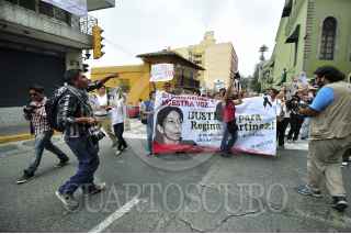 XALAPA,VERACRUZ., 28MARZO2013.- Al igual que en 11 ciudades del país, periodistas, colectivos estudiantiles, integrantes del Movimiento por la Paz así como el periodista y escritor Juan Villoro, marcharon en el centro histórico de Xalapa exigiendo justicia al gobierno estatal encabezado por el gobernador Javier Duarte de Ochoa, al cumplirse hoy el primer aniversario luctuoso de la periodista corresponsal de Proceso en Veracruz, Regina Martínez. FOTO: TONA NAVARRO / CUARTOSCURO.COM