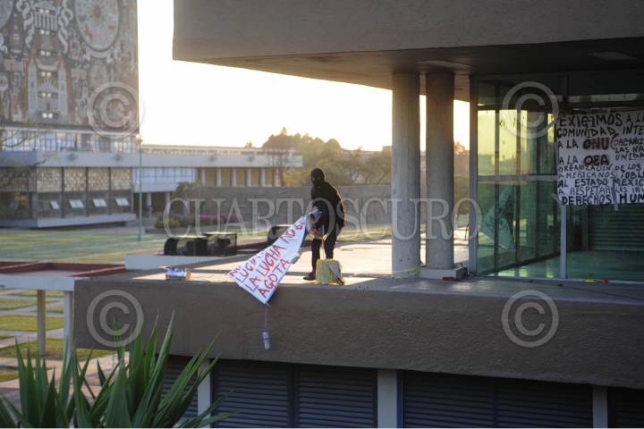 MÉXICO D.F. 01 MAYO 2013. Estudiantes de CCH que mantenían tomada la torre de rectoría de la UNAM desde hace 12 dias, se retiraron esta mañana dejando estas instalaciones en muy mal estado. FOTO: LUIS CARBAYO /CUARTOSCURO.COM