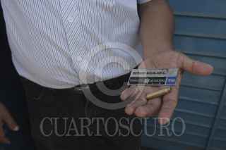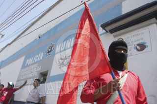 OAXACA, OAXACA, 01MAYO2013.- Integrantes del FPR protestaron e el exterior del cuartel de la Policía Municipal luego de la detención de 19 de sus compañeros durante la marcha del día del trabajo, los manifestantes exhibieron la placa de identificación de uno de los policías viales y el casquillo de un rifle de alto poder el cual accionaron durante la manifestación. FOTO: ARTURO PÉREZ ALFONSO /CUARTOSCURO.COM