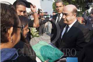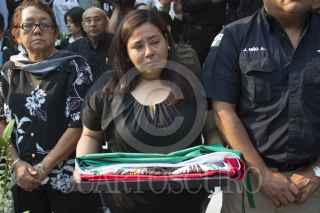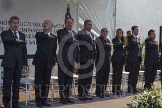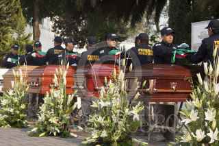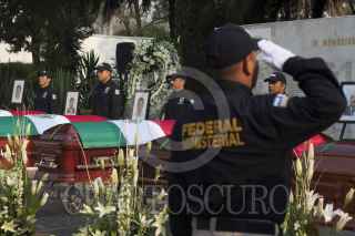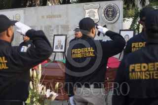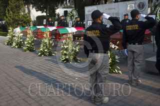 MÉXICO, D.F., 04MAYO2013.- Un homenaje de cuerpo presente se les realizó a los elementos de la PGR que murieron en un accidente de avioneta el pasado martes 30 de abril en el Municipio de Morelos, en Zacatecas. La aeronave marca King Air Bimotor con matricula XC-LMV transportaba a dos agentes ministeriales, el piloto, el copiloto y un mecánico. En instalaciones de la Policía Federal Ministerial familiares, amigos y funcionarios les rindieron homenajea los caídos en el cumplimiento de su deber, la ceremonia estuvó presidida por el Procurador General de la República Jesús Murillo Karam, quien entregó el lábaro patrio a sus dolientes. FOTO: MOISÉS PABLO /CUARTOSCURO.COM