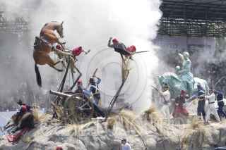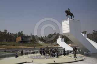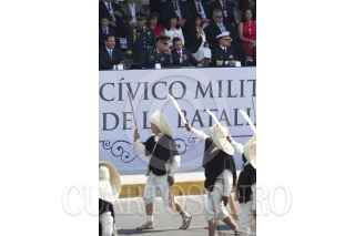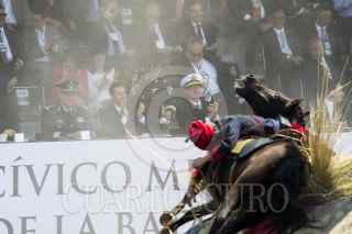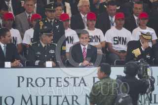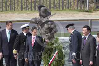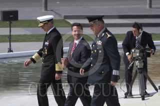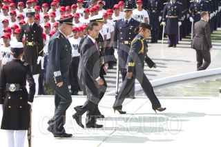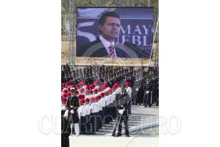 PUEBLA, PUEBLA, 05MAYO2013.- Enrique Peña Nieto, Presidente de México, acompañado de los secretarios de la Salvador Cienfuegos Zepeda, Defensa Nacional, Francisco Soberón Sanz, Secretario de la Armada de México y encabezo la ceremonia del 151 Aniversario de la Batalla de Puebla. Al momento de montar la Guardia De Honor, la ofrenda floral fue derribada por el viento. FOTO: GUILLERMO PEREA /CUARTOSCURO.COM