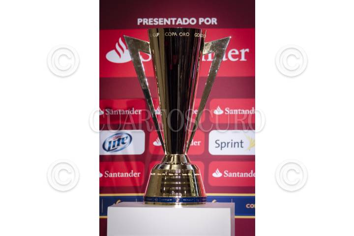 MÉXICO, D.F., 13MAYO2013.- José Manuel de la Torre, Director Técnico de la Selección Mexicana; Marcos Martínez, Presidente Ejecutivo de Santander México; Enrique Sanz, Secretario General de la Confederación de Fútbol de Norte, Centroamérica y el Caribe (Concacaf) y Justino Compeán, presidente de la Federación Mexicana de Fútbol (FMF); presentaron y develaron la nueva Copa Oro que se utilizará el próximo 28 de julio, en el Soldier Field de Chicago. FOTO: MISAEL VALTIERRA / CUARTOSCURO.COM