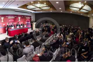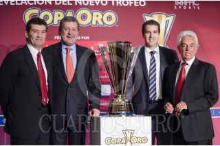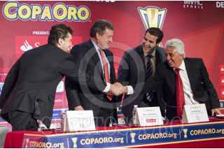 MÉXICO, D.F., 13MAYO2013.- José Manuel de la Torre, Director Técnico de la Selección Mexicana; Marcos Martínez, Presidente Ejecutivo de Santander México; Enrique Sanz, Secretario General de la Confederación de Fútbol de Norte, Centroamérica y el Caribe (Concacaf) y Justino Compeán, presidente de la Federación Mexicana de Fútbol (FMF); presentaron y develaron la nueva Copa Oro que se utilizará el próximo 28 de julio, en el Soldier Field de Chicago. FOTO: MISAEL VALTIERRA / CUARTOSCURO.COM