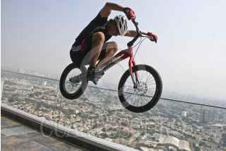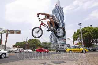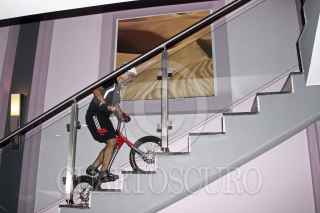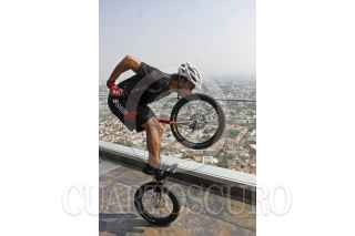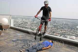 GUADALAJARA, JALISCO, 15MAYO2013.- El colombiano Javier Zapata, quien a impuesto seis veces Récord Guinness al subir a bordo de su bicicleta las edificaciones mas grandes de Latinoamérica, ascendió el Hotel RIU el mas alto en la ciudad y uno de los mas grandes de México porque consta de 41 pisos equivalentes aproximadamente a 1,066 escalones y en un tiempo de 33 minutos. FOTO: FERNANDO CARRANZA GARCÍA /CUARTOSCURO.COM