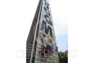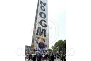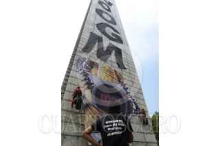 MÉXICO,D.F. 16MAYO2013.- Aproximadamente 8 integrantes de la organización Greenpeace, escalaron la Estela de Luz con equipo para este deporte, a una altura aproximada de 60 metros en donde colocaron mantas en protesta por la alteración y manipulación genética de algunos organismos como el Maíz Transgénico. Elementos policiacos de la SSP-DF intentaron impedir esta acción, logrando subir solo 4 escaladores para cumplir su cometido en donde permanecieron por aproximadamente 4 horas. FOTO:LUIS CARBAYO /CUARTOSCURO.COM