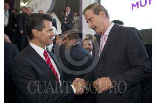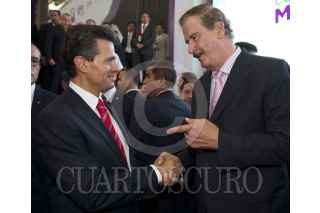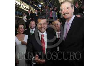 LEÓN, GUANAJUATO, 16MAYO2013.- El Presidente Enrique Peña Nieto saludó al expresidente Vicente Fox Quesada, con quien dialogó al término de la Conferencia Anual de Municipios 2013. El ex Mandatario asistió al evento en compañía de su esposa, Martha Sahagún Jiménez. FOTO: PRESIDENCIA /CUARTOSCURO.COM