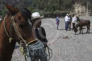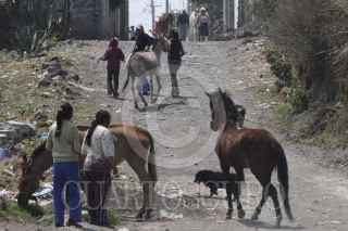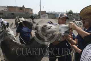 XALITZINTLAN, PUEBLA, 20MAYO2013.- Ante la posibilidad de que la población tenga que ser evacuada de la zona a causa de una contingencia volcánica mayor, en esta población se llevan a cabo acciones preventivas como el censo, la vacunación y desparasitación de animales de trabajo, por lo que los propietarios de caballos o burros asisten al modulo operado por estudiantes de veterinaria de la UPAEP, que ha instalado en las afueras de esta comunidad ubicada a escasos 12 kilómetros del cráter volcánico. FOTO: J. GUADALUOE PEREZ /CUARTOSCURO.COM