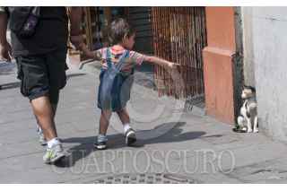 MÉXICO, D.F., 22MAYO2013.- Un niño que camina con su padre señala a un gato sentado sobre la calle Isabel la Católica en el centro histórico. FOTO: DIEGO SIMÓN SÁNCHEZ /CUARTOSCURO.COM