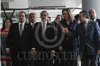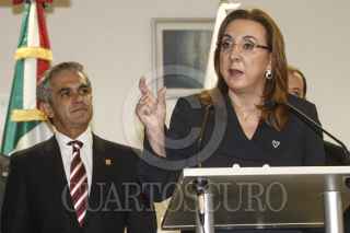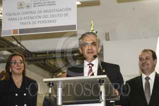MÉXICO, D.F., 22MAYO2013.- El procurador Rodolfo Fernando Ríos Garza, Miguel Ángel Mancera, jefe de gobierno capitalino, la fiscal Juana Camila Bautista Rebollar y Rosy Orozco, presidenta de la Comisión Unidos contra la Trata, durante la presentación de la Fiscalía Central de Investigación para la Atención del Delito de Trata de Personas. FOTO: ISAAC ESQUIVEL /CUARTOSCURO.COM