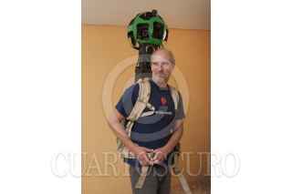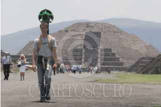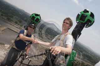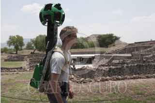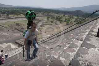 TEOTIHUACÁN, ESTADO DE MÉXICO 22MAYO2013.- El líder de desarrollo tecnológico para Street View de Google, Daniel Filip, y Steve Silverman, cargan unas cámaras de 360 grados de alta definición con 15 lentes. Google en conjunto con el Instituto Nacional de Antropología e Historia (INAH) presentaron ese equipo denominado Trekker, que poseé también un disco duro, dos antenas GPS, y un dispositivo movil. Con un peso aproximado de 19 kilos, con el cual se realizó la captura de las imágenes de las Pirámides de Teotihuacan, sin dañar el patrimonio histórico. Estas imágenes serán las primeras que se subirán al servicio Street View a finales de año. La firma ya tiene recorridos virtuales en 34 zonas arqueológicas en el país, pero esta es la primera vez que se realiza con este equipo en una piramide a nivel mundial. FOTO: JUAN PABLO ZAMORA /CUARTOSCURO.COM
