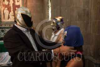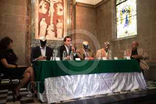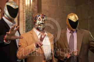 MÉXICO, D.F., 23MAYO2013.- En el centro cultural Juan Luis de Alarcón en la Capilla Británica, se llevó a cabo la presentación de "La Batalla del Milenio" a cargo de Hernardo Peniche, productor de Universal via Pegazo Producciones, Jesús Andone, Presidente y Hened Curi,directora de relaciones Públicas de la Productora Universal, en compañía de Mil Mascaras, Tinieblas y Tinieblas Jr. FOTO: ALEJANDRO NEYRA /CUARTOSCURO.COM