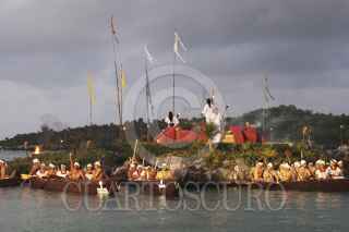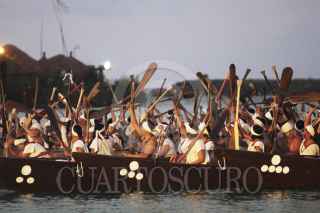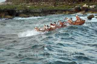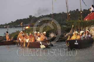 XELHA, QUINTANA ROO, 24MAYO2013.- Salida de los 300 canoeros de la Travesía Sagrada Maya que comprende aproximadamente 50 kilómetros durante 6 o 7 horas de remo libre a lo largo del Canal de Cozumel que tiene 420 metros de profundidad y una corriente marina de sur a norte de 2 a 4 nudos, sumados al nivel de riesgo y gran esfuerzo físico para los remadores. El proyecto de La Travesía Sagrada Maya dio comienzo en 2007 y se basa en el propósito de rescatar y recuperar una de las más significativas tradiciones de los mayas ancestrales de la región: La trayectoria ritual del Canal Cozumel para venerar a la diosa IxChel. Esta recreación revive el interés en la cultura maya y fortalece la identidad de los pobladores del área. FOTO: ELIZABETH RUIZ /CUARTOSCURO.COM