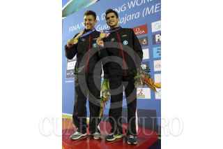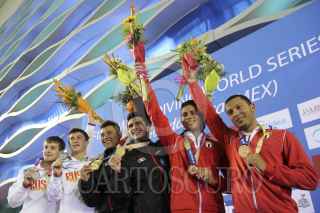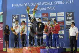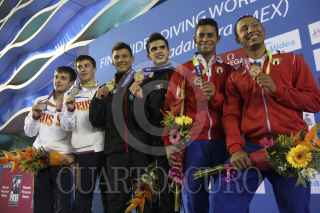 ZAPOPAN, JALISCO, 24MAYO2013.- Este medio día se llevaron a cabo las finales de Clavados Sincronizados en Plataforma de 10 metros Varonil, en donde los Mexicanos Iván García y German Sánchez se llevaron la presea dorada, asi como los Rusos Victor Minibaev y Artem Chesakov la plateada y José Antonio Guerra y Jeinkler Aguirre de Cuba la de bronce; los Colombianos Juan Ríos y Víctor Ortega quedaron en la cuarta posición. FOTO: FERNANDO CARRANZA GARCÍA /CUARTOSCURO.COM