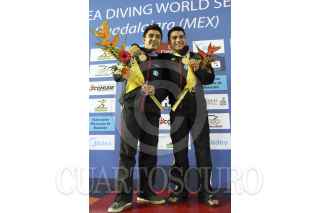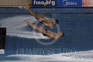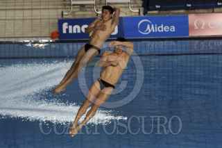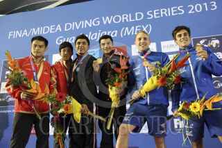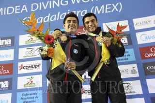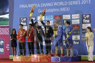 ZAPOPAN, JALISCO, 24MAYO2013.- Esta tarde se llevaron a cabo las finales de Clavados Sincronizados en Trampolín de 3 metros Varonil, en donde los Mexicanos Yahel Castillo y Daniel Islas se llevaron la medalla de oro, los Chinos Shixin Li y Chao He la de plata, así como los Británicos Nicholas Baker Robinson y Christopher Mears la de la de bronce. FOTO: FERNANDO CARRANZA GARCÍA /CUARTOSCURO.COM