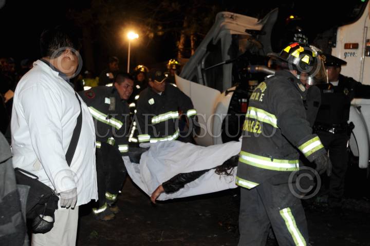 MÉXICO D.F., 24MAYO2013.- Cinco personas pierden la vida al quedar aplastados dentro del auto Seat, por un trailer que quedo sin frenos en la bajada de la carretera Picacho Ajusco a la altura del Km. 11 en la colonia Torres de Padierna delgación Tlalpan. Peritos y bomberos de esta demarcación acuieron al lugar para el rescate de los cuerpos. FOTO: LUIS CARBAYO /CUARTOSCURO.COM